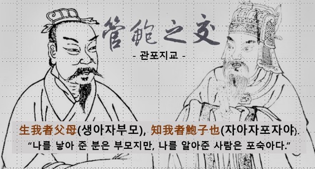 이처럼 포숙은 관중을 누구보다 잘 알아 주었습니다. 그래서 ‘자신을 알아주는 이’라 하여 친한 친구를 지기(知己)라고 부르지요. 옛 사람들은 두 사람의 우정을 보고 이렇게 말했습니다. "得ᅳ知己 死亦無憾(득일지기 사역무감), 자기를 알아주는 사람을 한 명이라도 얻으면 죽어도 유감이 없다."