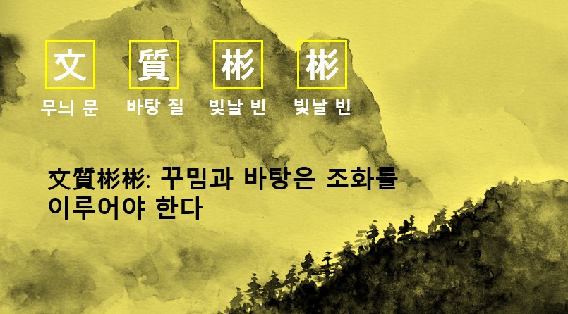 하나는 문질빈빈(文質彬彬)으로. 「논어」 <옹야편>애 나오는 내용입니다. . 공자가 말하기를, "바탕이 꾸밈을 이기면 투박해지고, 꾸밈이 바탕을 이기면 겉만 요란하다. 꾸밈과 바탕이 조화를 이룬 뒤에야 군자라고 할 수 있다."고 했습니다. [質勝文則野(질승문즏야) 文勝質則史(문승질즉사) 文質彬彬(문질빈빈) 然後君子(연후군자)}"