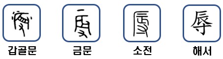 辱자는 ‘욕되다’나 ‘더럽히다’, ‘모욕하다’라는 뜻을 가진 글자이다. 辱자는 辰(별 진)자와 寸(마디 촌)자가 결합한 모습이다. 辰자는 농기구의 일종을 그린 것이다. 여기에 사람의 손을 그린 寸자가 결합해 있으니 辱자는 밭일하는 모습을 그린 것이라 할 수 있다. 辱자의 갑골문을 보면 농기구를 손에 쥔 모습이 그려져 있었다. 그런데 농기구 주위로 점이 찍혀있다. 이것은 농기구로 풀을 베는 모습을 표현한 것이다. 그래서 辱자의 본래 의미는 ‘풀을 베다’나 ‘일을 한다’였다. 그러나 일이 고되다는 뜻이 확대되면서 후에 ‘욕되다’나 ‘더럽히다’라는 뜻을 갖게 되었다.(네이버 한자사전)